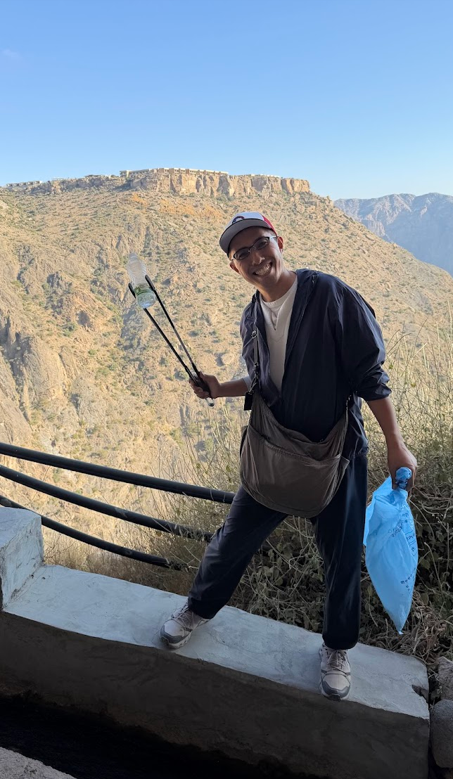 一歩向こうは崖の下、みたいなところを、このオマーンのツアーはお客さんを連れて行きます。ガイドのムアッドさんによると、怖すぎて泣いてしまうお客さんもいるとかいないとか(苦笑)。私も、高所恐怖症なのでまあまあ怖かったですが、命をかけてゴミ拾いしてきました♪