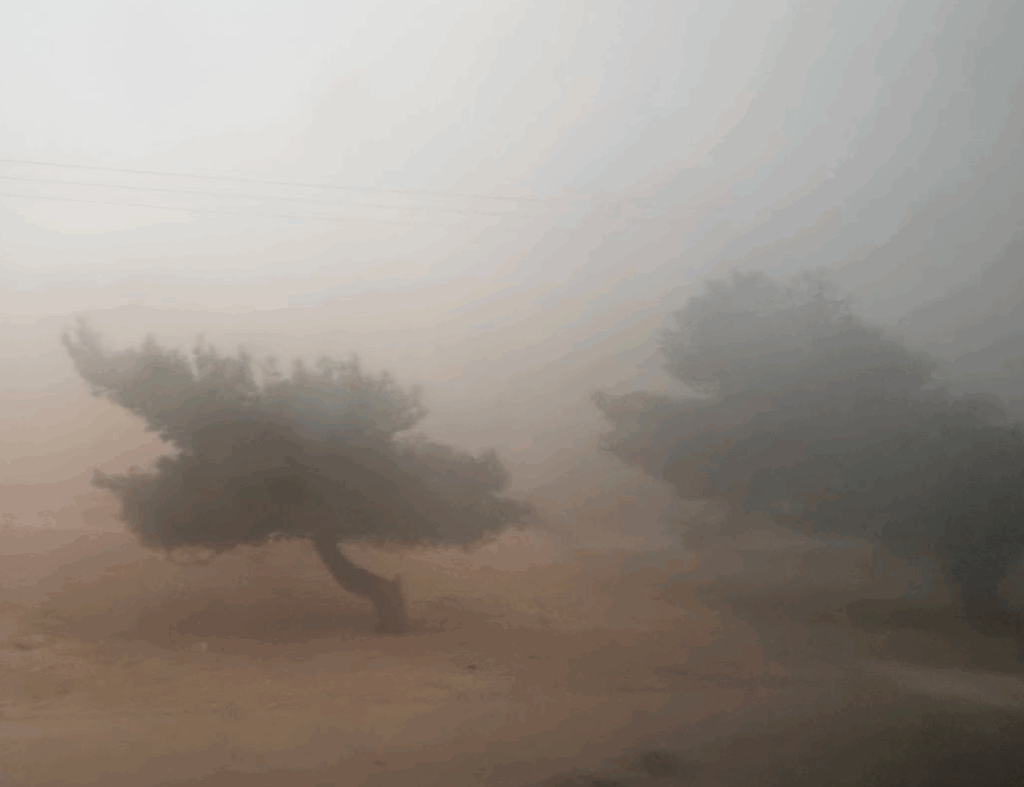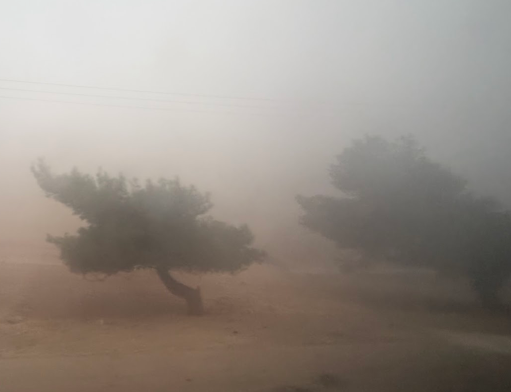 ペトラ遺跡へ向かう車窓から。風で、木の幹が変形しています(苦笑)。風力発電がいくつもあったので、よっぽど風が強いところのようですね。風の強さで、砂岩を削り、独特の景色がヨルダンのワディラムなどで形成されています。それだけ、風が強い地域のようです。砂嵐もたびたび起こるんだとか。