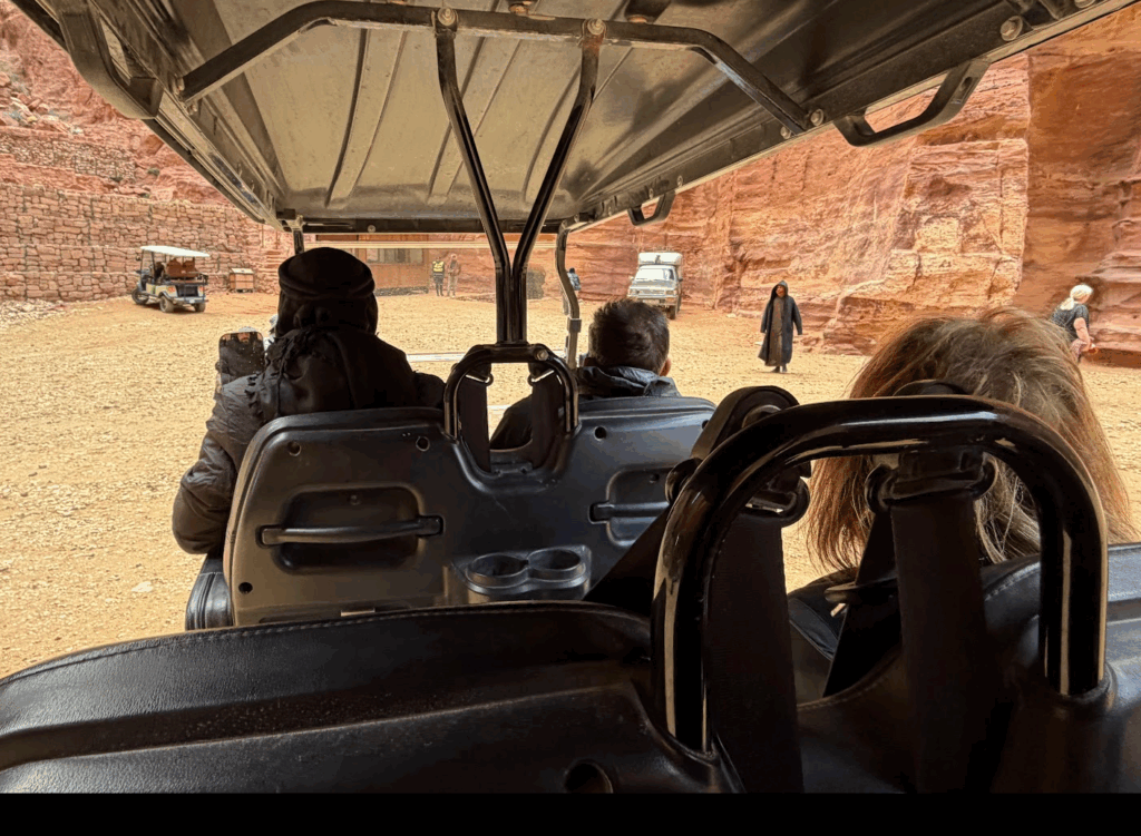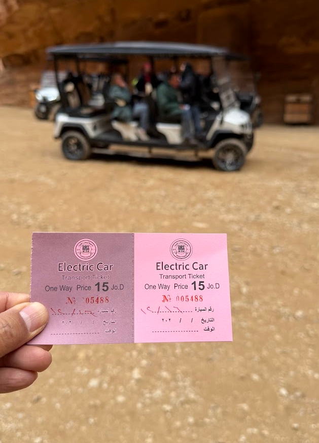 帰り道は、1人3300円もする電動カートに乗って、ペトラ遺跡の入り口まで戻ります(笑)。歩けば40分くらいのところを10分くらいで戻ります。10分のタクシーと考えると世界一高額かも(苦笑)。これは、完全に「ネタ」として乗りました(笑)。帰り道は時間的な余裕も体力的な余裕もありましたが、世界一高額であろう、電動カートに「体験」として乗ってみたくてトライしました(笑)。人生初体験を増やすと、「ああ、今日は楽しかった、新たな体験ができた」と思える確率が上がります。すると、いつ死んでも後悔しない生き方になりやすくなります♪