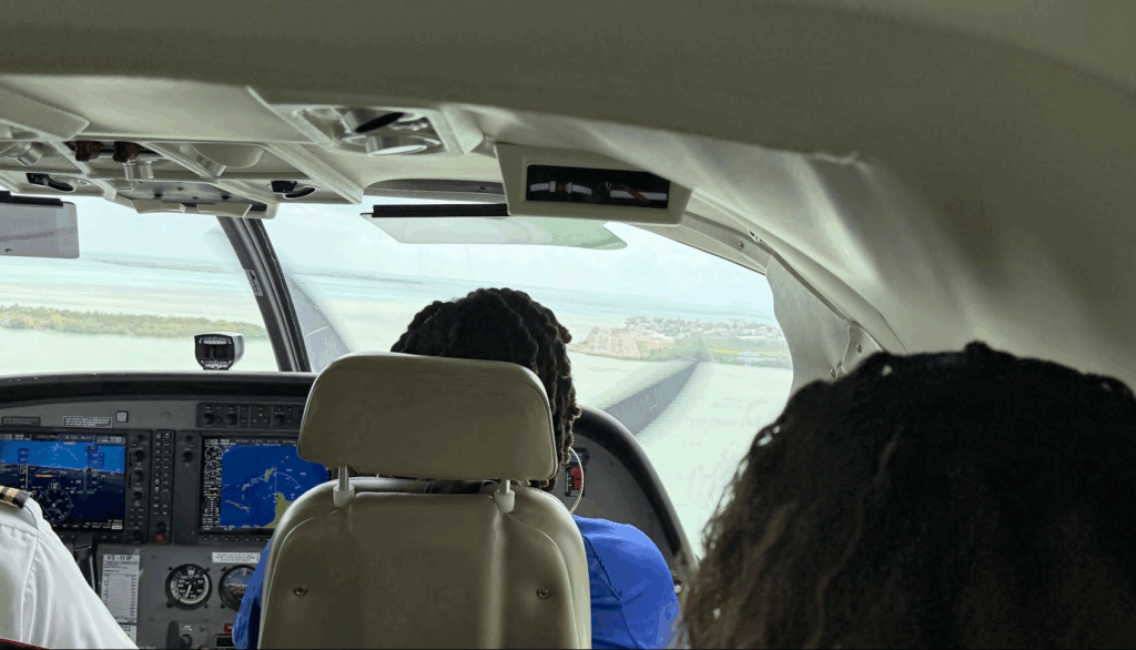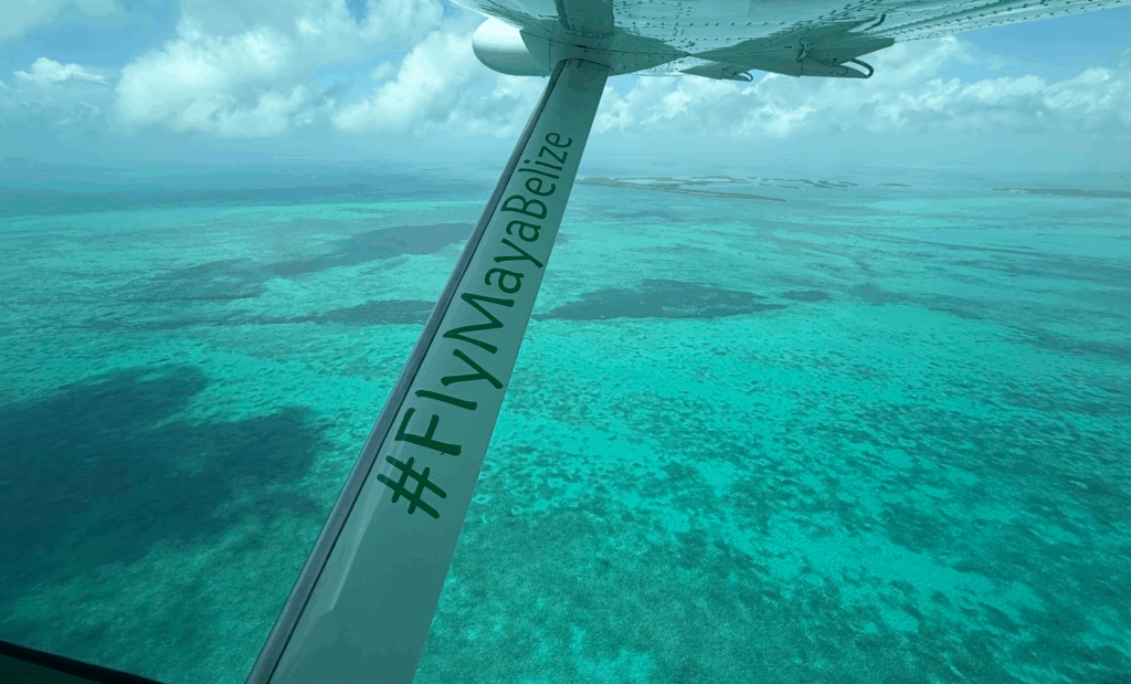 ベリーズの上空から美しい珊瑚礁の海を見て写真を撮ってました♪