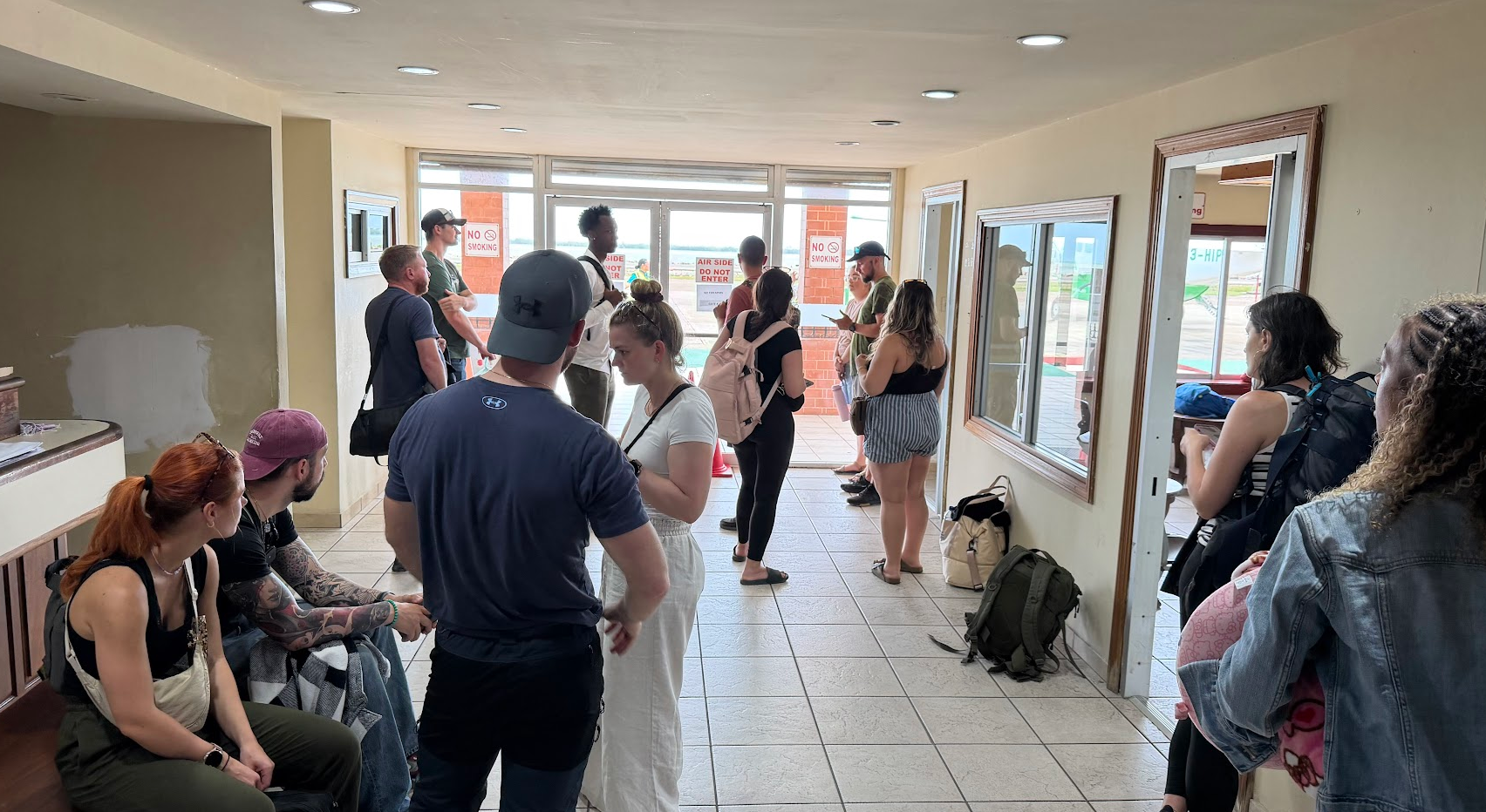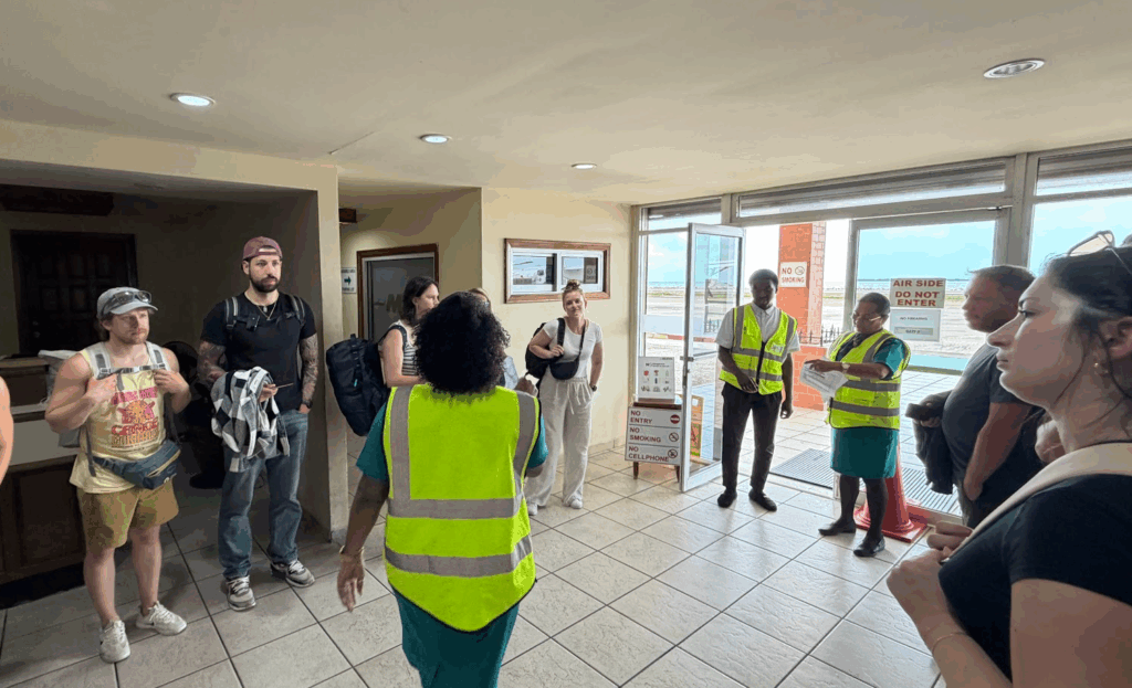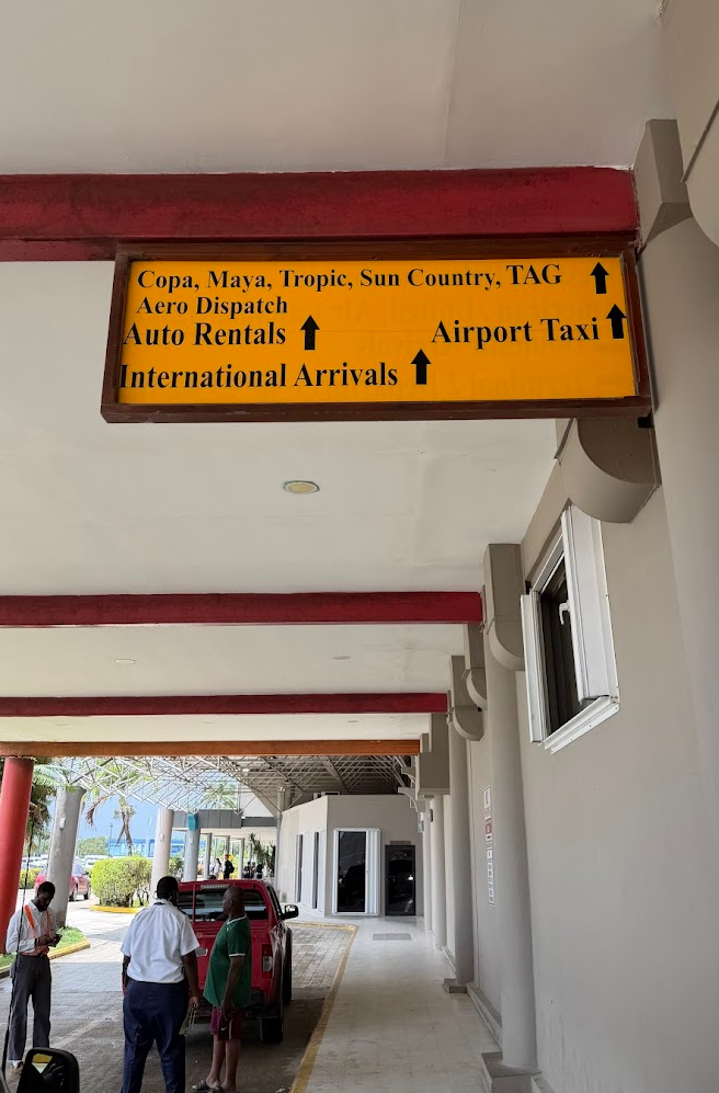 ようやくベリーズシティの空港に到着♪ と思っていたら、機長から何やらアナウンス・・・。聞き取れないでいると、欧米人の乗客の女性が、