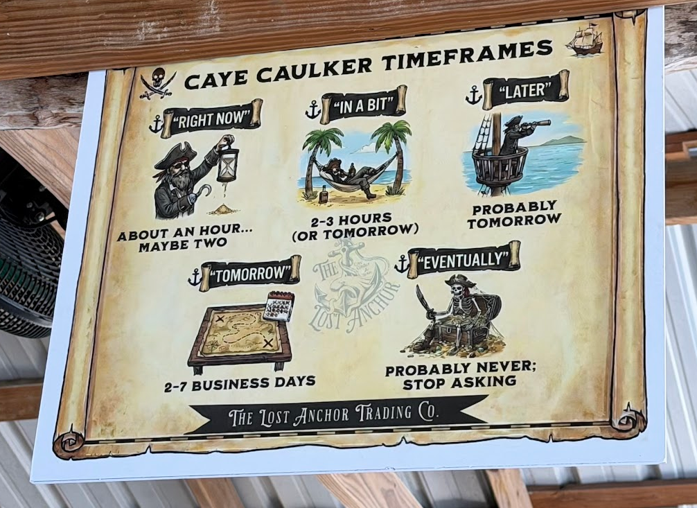 さて、ベリーズのキーカーカー島で食事をしたレストランに、こんな貼り紙が貼ってありました。いかに、ベリーズの人たちが、いい意味でも悪い意味でも「テキトウ」で、緩くて、時間にルーズかがわかる解説です(笑)。