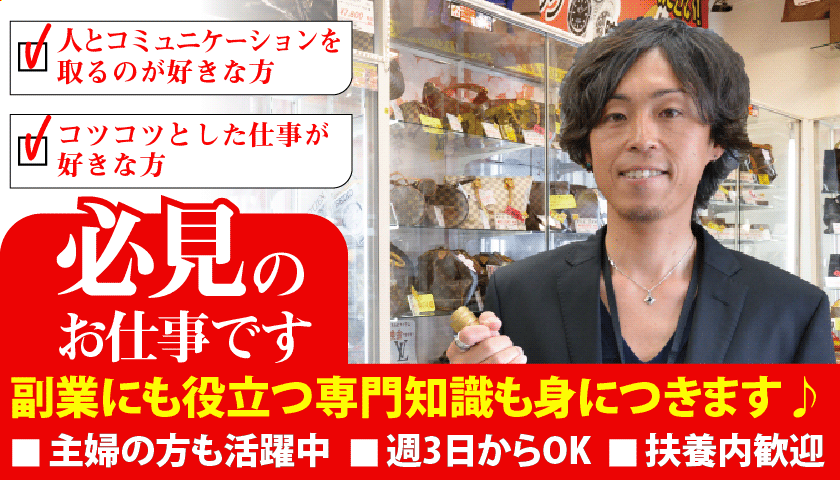 わたしたちは、ブランドバッグやブランド財布、洋酒や日本酒、切手やクオカードなどを店頭・インターネットで販売しているお店です。 ブランド品やジュエリーの知識は必要ありません。今いるスタッフさんはみんな未経験からスタートしました。人と話すことが好きな方、接客業にやりがいを感じる方はぜひご応募ください。主婦パートさんも活躍中です。ネイルOKの和やかな職場です。 電話やメールで質問も受付中です。お気軽にお問い合わせください。 |