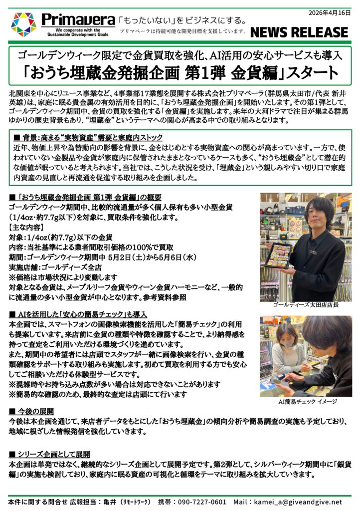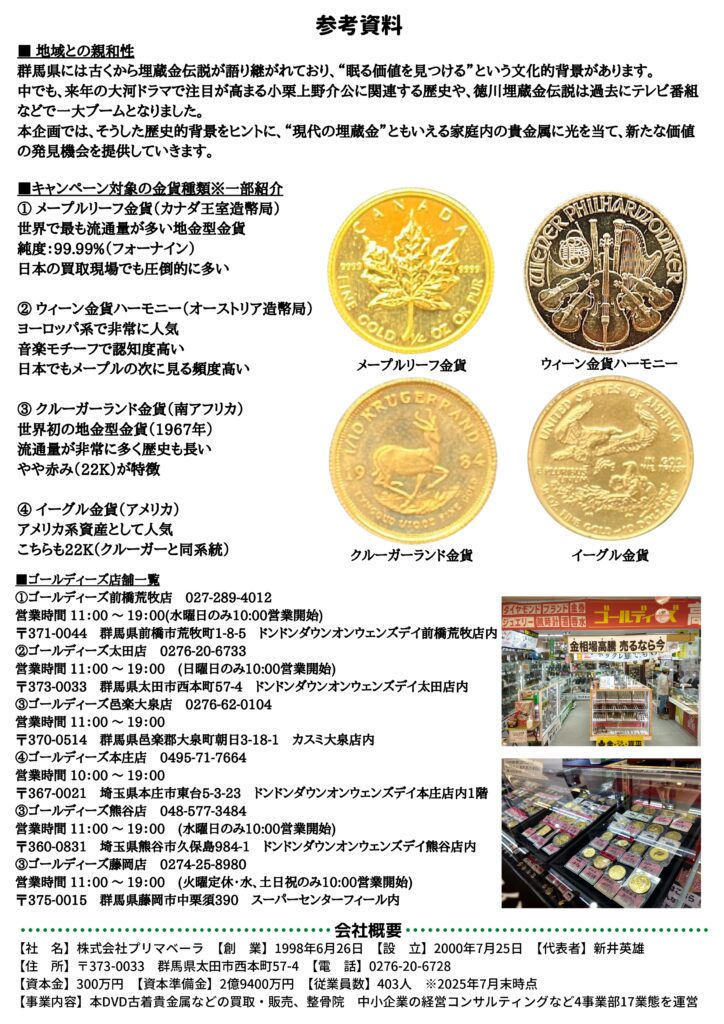 北関東を中心にリユース事業など、4事業部17業態を展開する株式会社プリマベーラは、家庭に眠る貴金属の有効活用を目的に、ゴールディーズ6店舗にて「おうち埋蔵金発掘企画」を開始いたします。その第1弾として、ゴールデンウィーク期間中、金貨の買取を強化する「金貨編」を実施します。来年の大河ドラマで注目が集まる群馬ゆかりの歴史背景もあり、“埋蔵金”というテーマへの関心が高まる中での取り組みとなります。